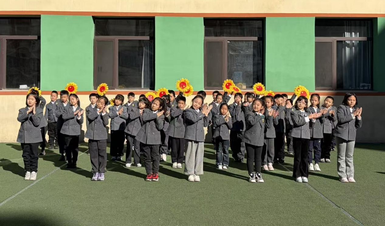 伴随着悠扬的出旗曲,出旗手迈着整齐步伐,护卫鲜艳国旗走向升旗台。庄严激昂的国歌声里,五星红旗缓缓升起,全体师生昂首挺立,面向国旗行注目礼,以最庄重姿态,诉说对祖国的赤诚,传递民族团结的心声。二年八班的同学们带来舞蹈《爱我中华》,稚嫩脸庞映着笑容,灵动身影在舞台上跳跃流转。随着旋律响起,孩子们用轻快的舞步、真挚的眼神,把对祖国、对中华民族的热爱都融入了这场充满朝气的表演里。