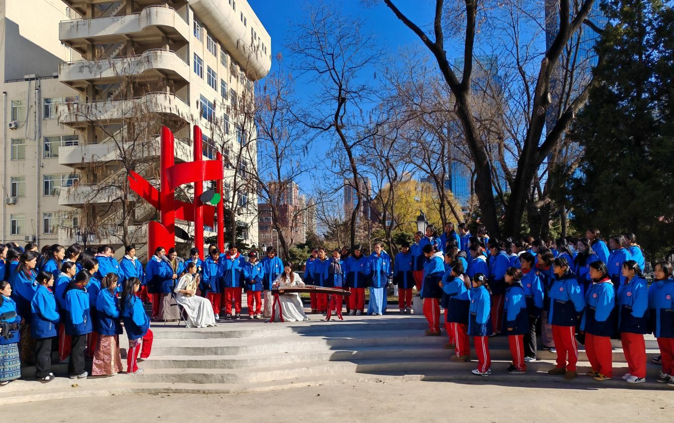 18日上午,沈阳市艺术幼儿师范学校西藏班学子怀着崇敬之心走进沈阳音乐学院,开启了一场跨越时空的文化对话。在讲解员的引导下,学子们先后参观校史馆与劫夫园:校史馆内,泛黄的乐谱手稿、珍贵的演出影像、历经岁月洗礼的乐器实物,系统展现了沈阳音乐学院百年来坚守艺术教育初心、培育万千艺术人才的辉煌历程,让学子们深刻感受着“鲁艺”精神的传承与发展;劫夫园内,革命音乐家李劫夫的雕像庄严肃穆,学子们驻足凝视,认真聆听先辈们以音乐为刃、以艺术报国的感人故事,家国情怀在潜移默化中厚植。参观间隙,西藏班学子献上了充满雪域风情的歌舞表演,沈阳音乐学院学子则以古筝独奏、二胡重奏、街舞、古典舞等形式回应,多元艺术碰撞出奇妙的火花。各族学生用艺术作媒介,将文化认同内化于心、外化于行。